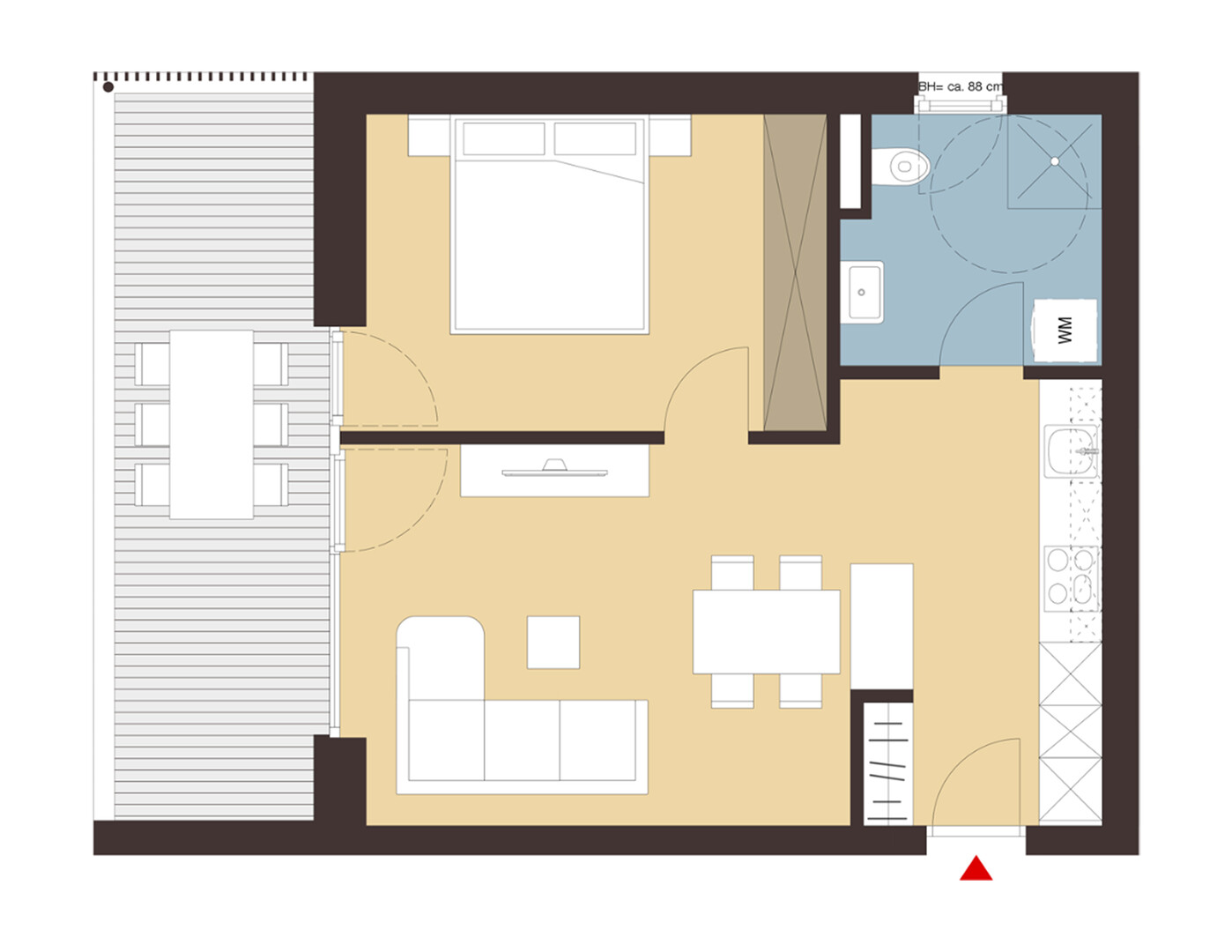 Ein durchgängig offener Wohnbereich und ein separates Schlafzimmer bieten eine ideale Raumaufteilung für eine oder zwei Personen. Die Terrasse ist direkt vom Wohnbereich aus zugänglich und erweitert den Wohnraum ins Freie.