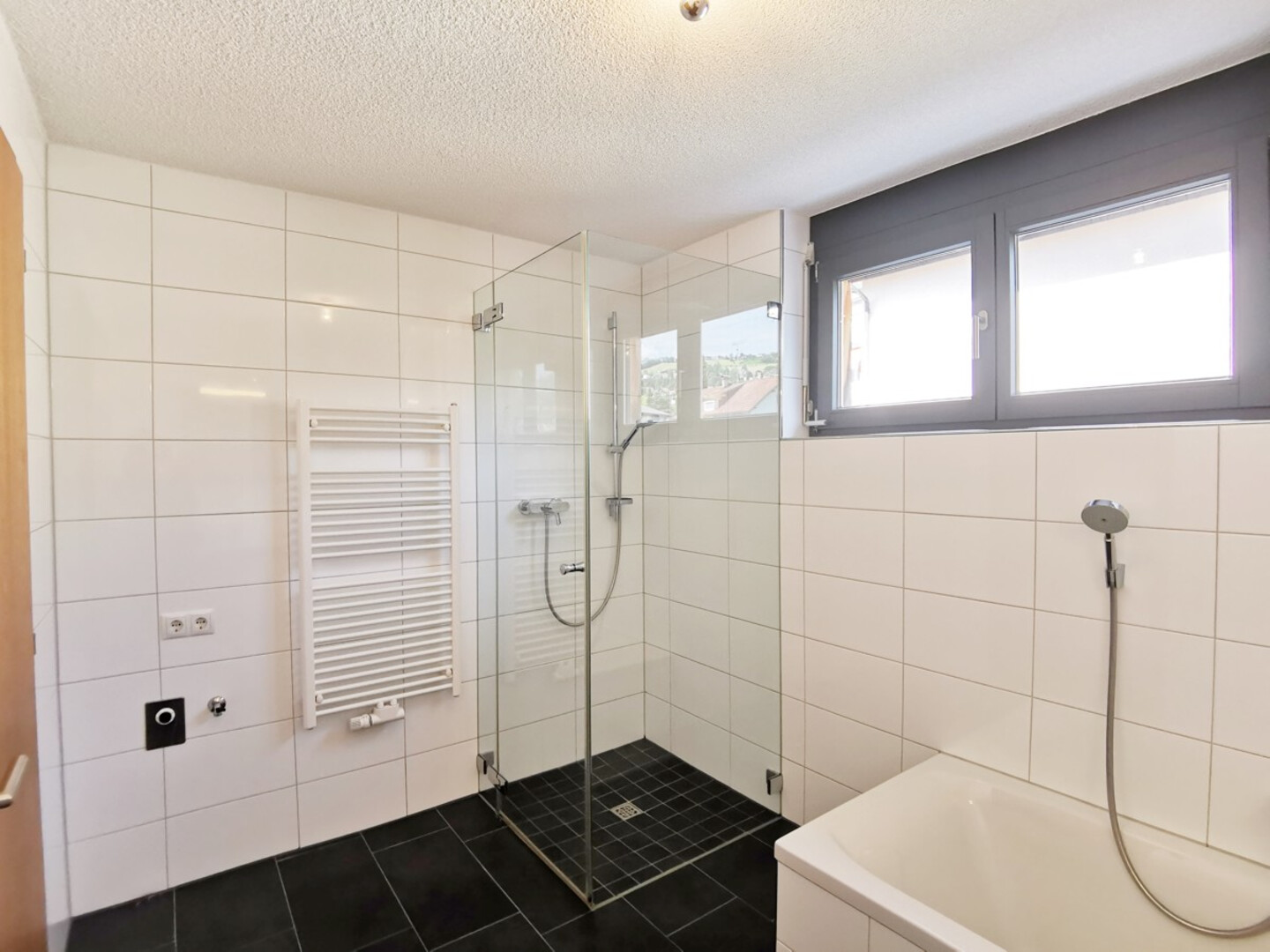 Das Badezimmer verfügt über eine Badewanne, eine Dusche ein Fenster, welches den Raum mit genügend Tageslicht versorgt. Der Waschmaschinenanschluss ist ebenso im Badezimmer situiert.
