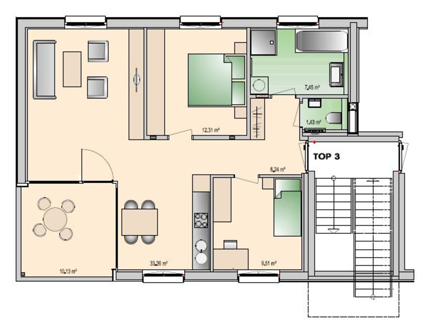 Die 3-Zimmerwohnung verfügt über ca. 70 m² Wohnfläche und ist im 1. Obergeschoss situiert. Sie ist mit einem Parkettboden ausgestattet. Das Bad und das separate WC sind modern gefliest.