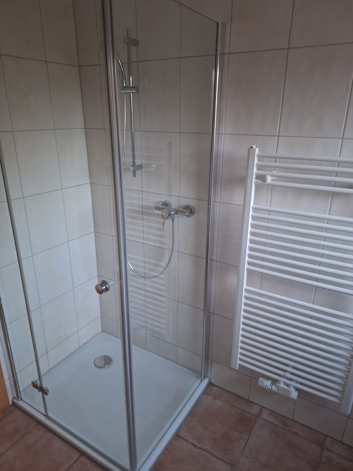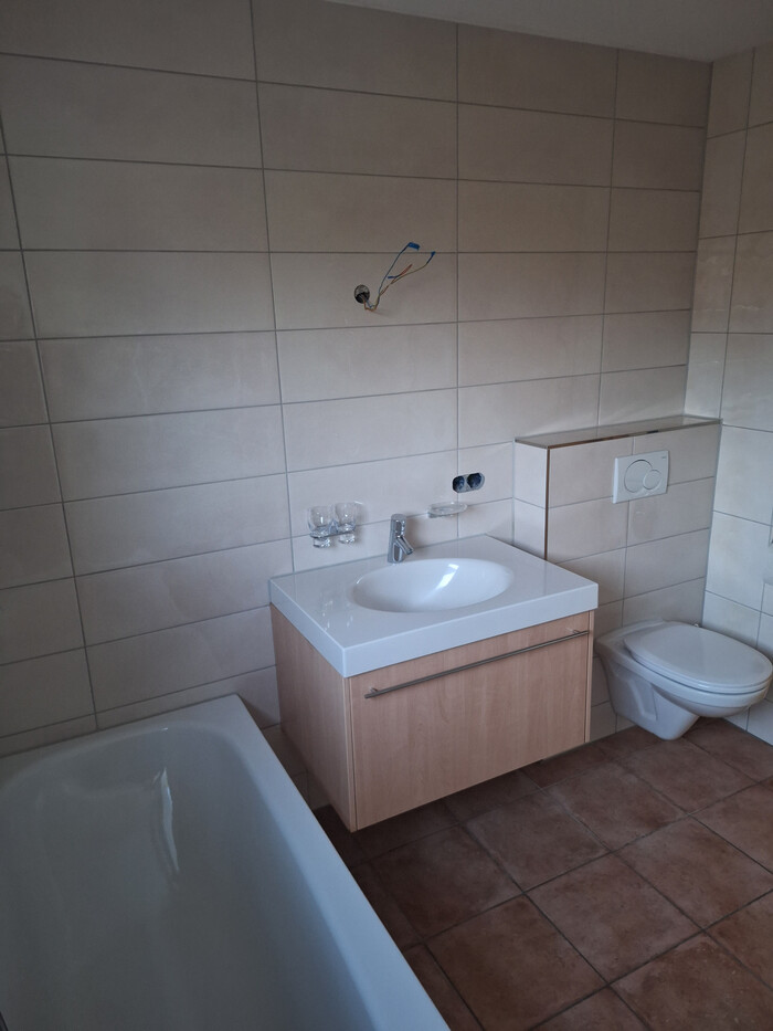 - Badezimmer mit Badewanne, Dusche, WC und Waschmaschinenanschluss