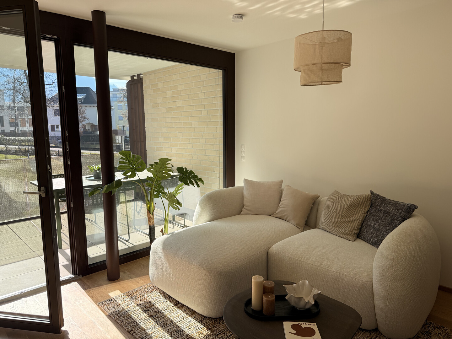 Sonnige Wohnqualität: Die überdachte Terrasse dieser Obergeschosswohnung schafft ein geschütztes Outdoor-Wohnzimmer, das zu jeder Jahreszeit genutzt werden kann. Genießen Sie die Aussicht und das helle, offene Wohnkonzept.