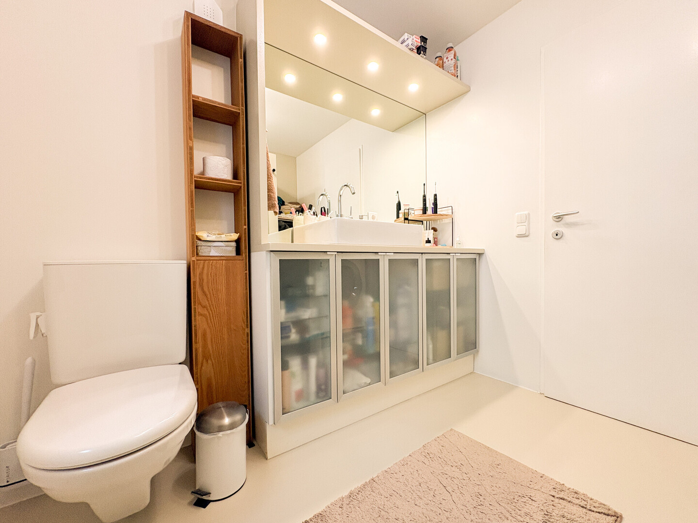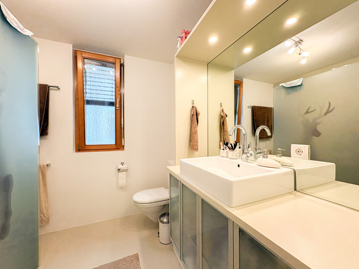 Das stilvolle, fugenlos ausgeführte Badezimmer mit Dusche, WC und Fenster präsentiert sich modern und pflegeleicht. Ein praktischer Abstellraum sorgt für zusätzlichen Komfort im Alltag.