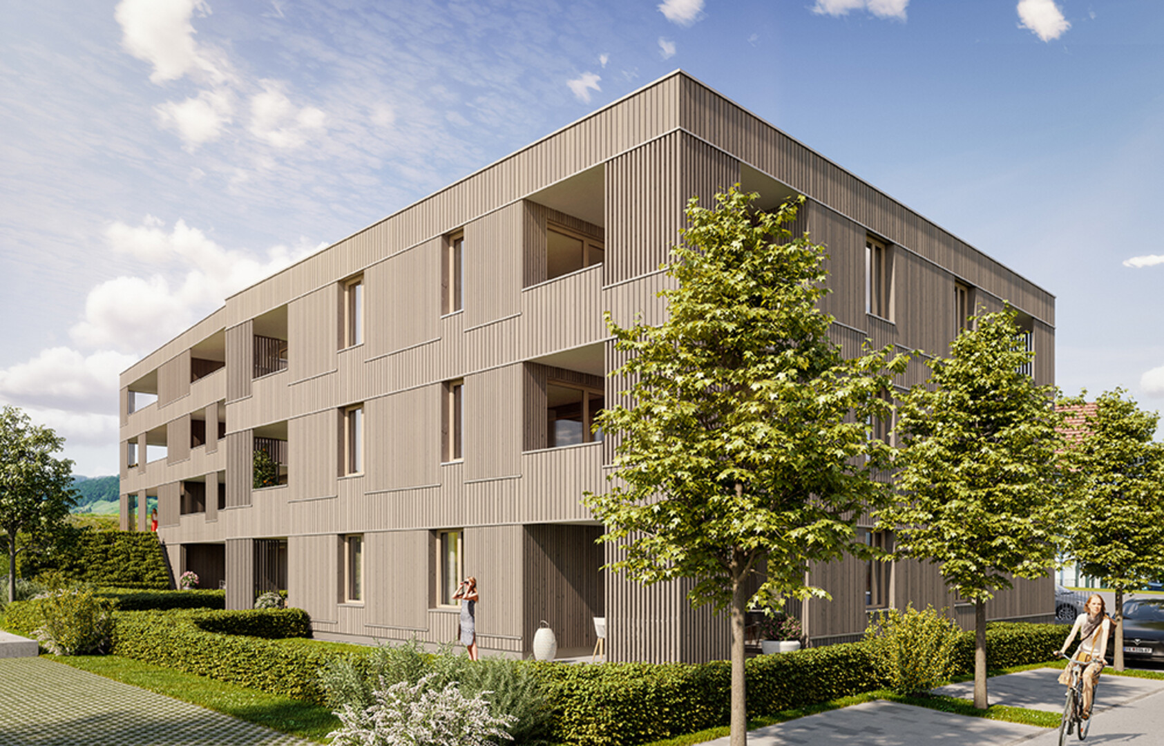 In Lustenau, in herrlicher Lage direkt am Rheindamm, verwirklicht ZIMA mit dem Neubauprojekt Wichnerstraße zwei Baukörper mit insgesamt 15 Wohnungen. Durch die in der Höhe leicht versetzte Anordnung der beiden Gebäude, werden ein offenes Wohngefühl und Privatsphäre geschaffen. Die Ausrichtung der Wohnungen ist optimal gewählt – helle Räume, große Fensterflächen und viel Sonne machen jede Einheit zu einem Rückzugsort mit Wohlfühlfaktor. Die Holzfassade sorgt für ein behagliches, zeitloses Erscheinungsbild der beiden Wohnhäuser.