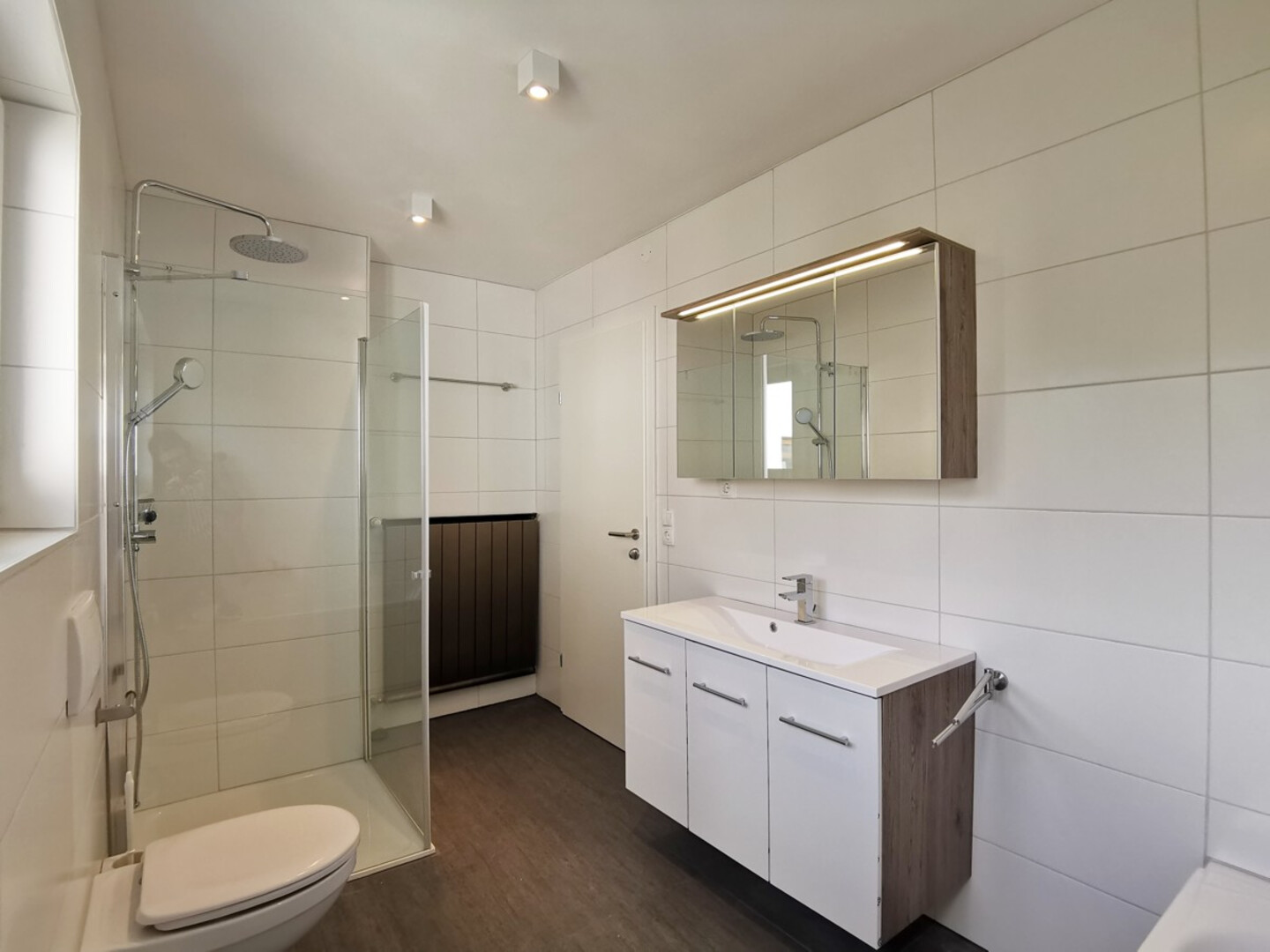 Die Wohnung ist mit einem Parkettboden und in den Nasszellen mit Fliesen ausgestattet. Das Badezimmer verfügt über eine Badewanne, eine separate Dusche mit Regendusche, ein Waschbecken verbautem Unterschrank sowie über ein WC. Der Waschmaschinenanschluss ist ebenfalls im Badezimmer situiert. Ein Fenster, welches den Raum mit genügend Tageslicht versorgt, ist vorhanden. Ein praktischer Abstellraum sowie ein separates Gäste-WC befinden sich im Flur.