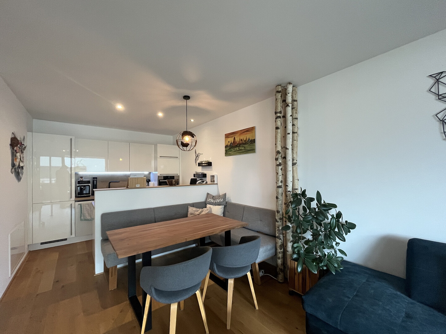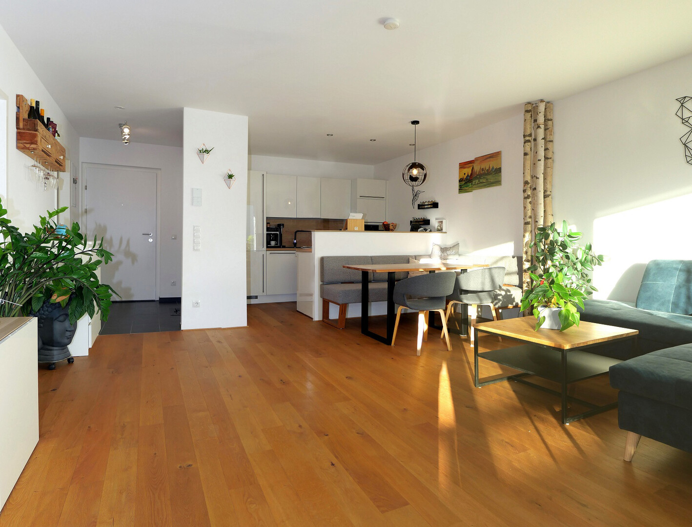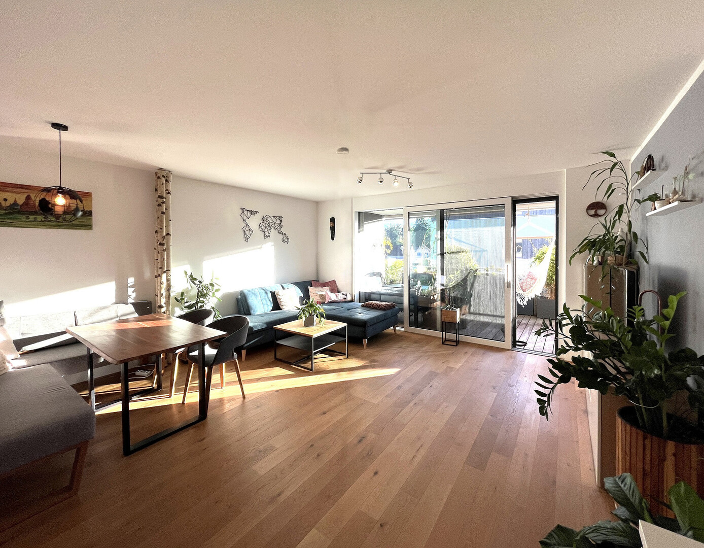 Ausstattung: moderne Einbauküche, offener Wohn-/Essbereich, Bad mit Dusche & Wanne, WM-Anschluss. Zugang zur Terrasse über Hebeschiebetür, dazu elektrischer Sonnenschutz und Jalousien (teilweise mit Insektenschutz). Beheizung über Pelletsanlage mit Fußbodenheizung und Einzelraumsteuerung.