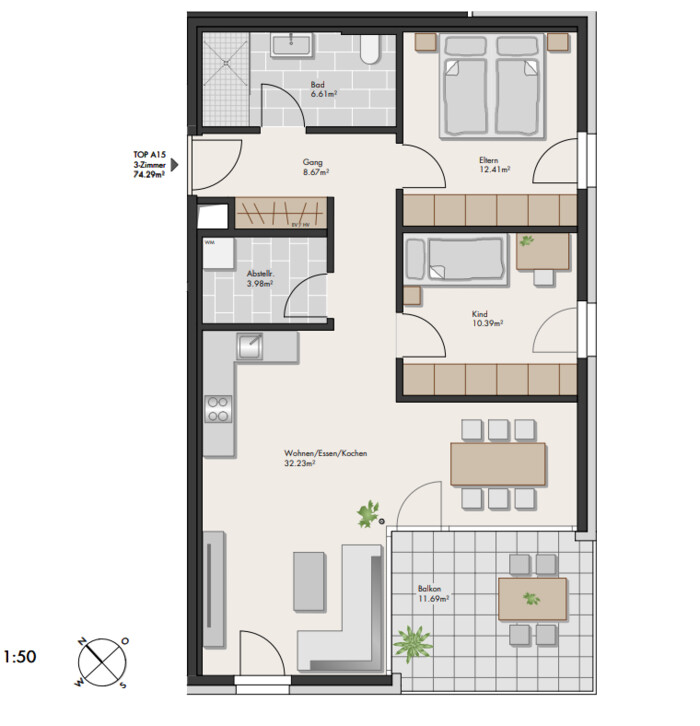 Aufteilung: Diele, Wohn/Esszimmer mit Küche, 2 Schlafzimmer, Dusche/WC, Abstellraum, Balkon, Kellerabteil
