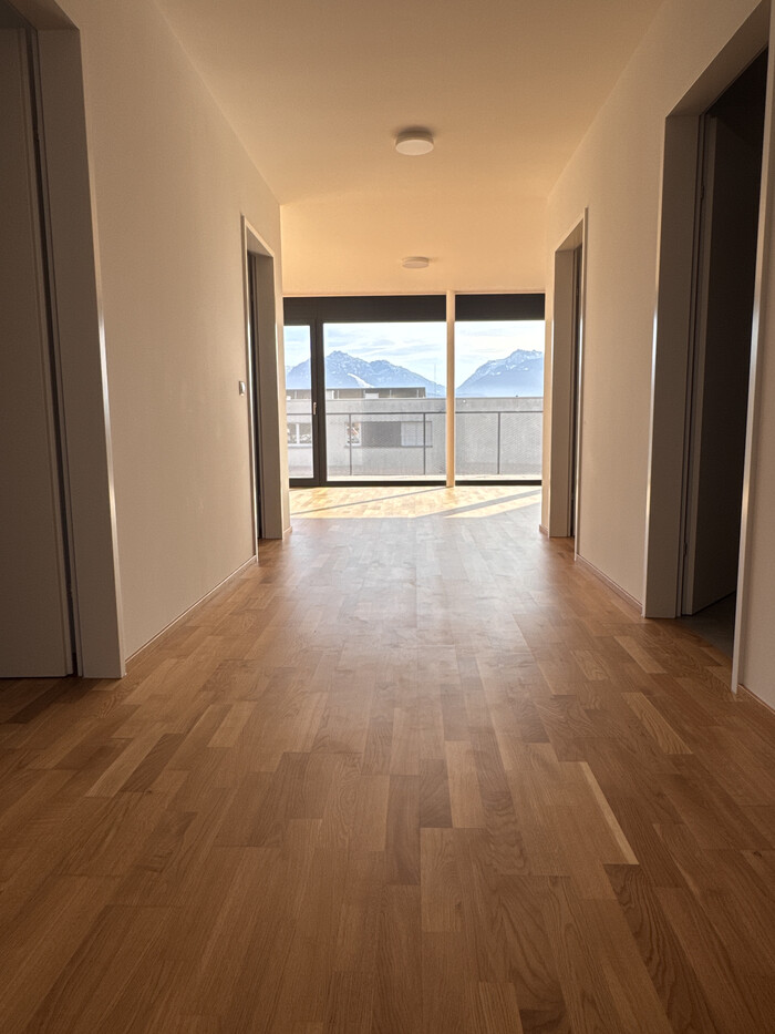 Als Herzstück präsentiert sich der großzügige Wohnraum mit feinem Echtholzparkett, das dem Ambiente eine warme und zugleich elegante Note verleiht. Die großflächigen Glasfronten eröffnen einen unverbaubaren Blick ins Grüne sowie auf das beeindruckende Bergpanorama – ein Ausblick, der jeden Tag aufs Neue begeistert. Der direkte Zugang zum weitläufigen Balkon erweitert den Wohnraum ins Freie und macht sie an sonnigen Tagen zum perfekten Ort für entspannte Stunden oder ein Frühstück mit Aussicht.