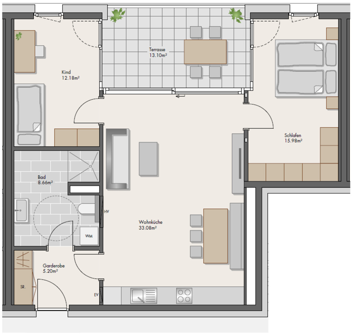Auf 75 m² Wohnfläche erwartet dich ein durchdachter Grundriss mit einem großzügigen Wohn‑Essbereich, einem geräumigen Schlafzimmer sowie einem flexiblen Büro‑, Kinder- oder Gästezimmer. Die großen Fensterfronten sorgen den ganzen Tag über für ein sonniges, freundliches Ambiente.