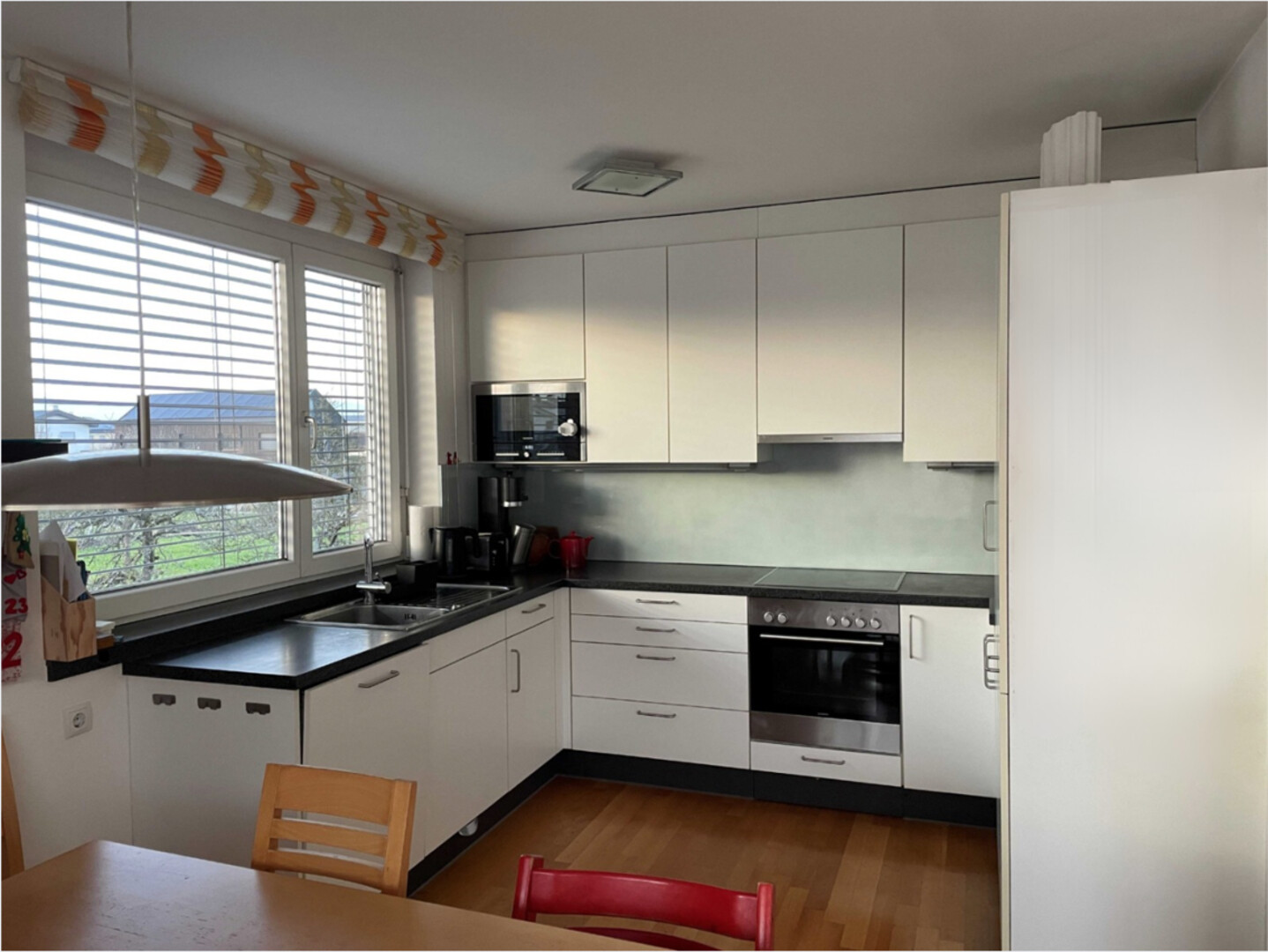 Offene Wohnküche, funktional und mit viel Stauraum, gemütliche Essecke.