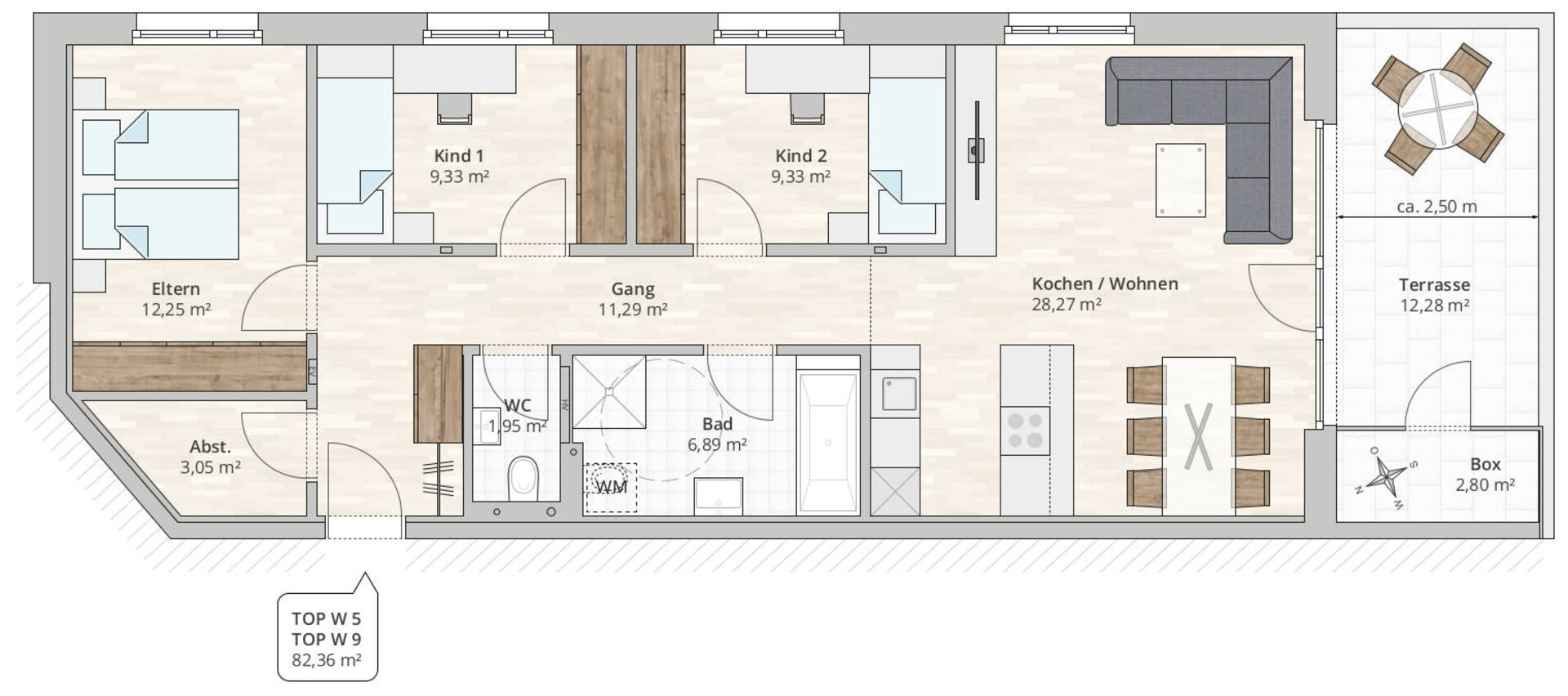 Parkett, Fliesen im Bad/WC und Türblätter können vom Käufer noch ausgewählt werden.